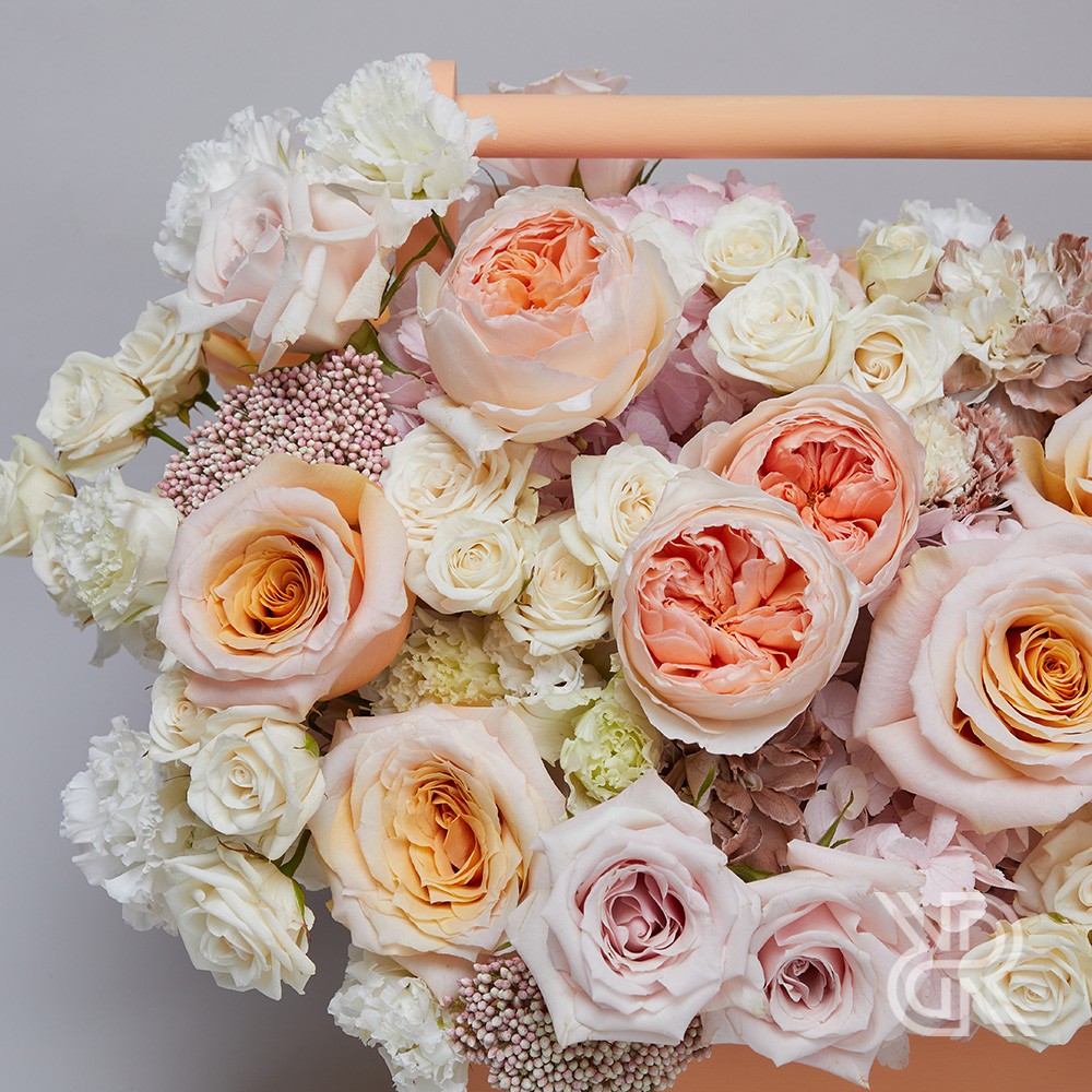 Нежная композиция в ящике в бело-кремовой цветовой гамме. В составе: розы сортов Феникс, Свит Мента и Джульетта Дэвида Остина, гортензия, озотамнус, махровая эустома, диантус, кустовые розы, и стипа.