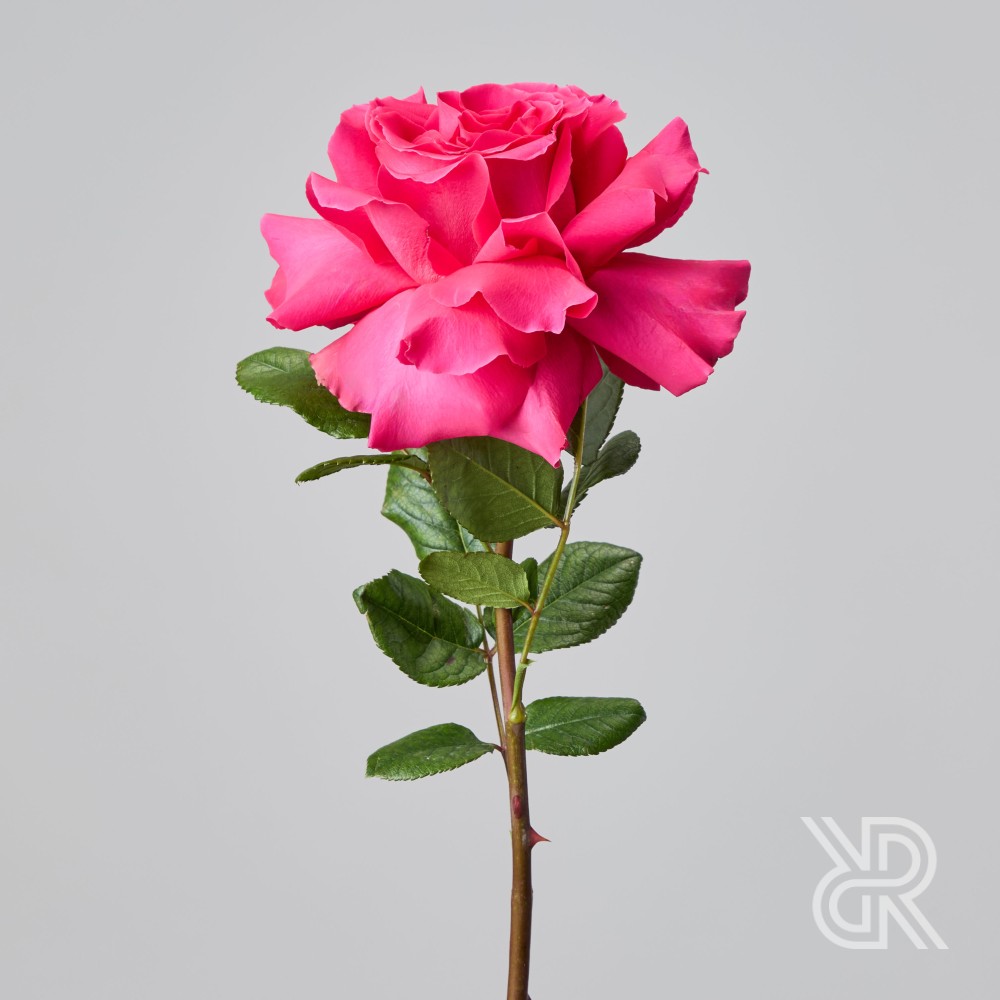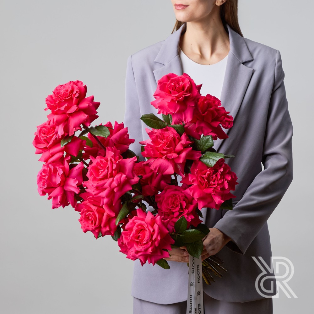 Монобукет из 15 роз сорта Фулл Монти. Характеризуется ярким фуксийным окрасом, крупным бутоном, состоящим из множества ажурных лепестков и тонким изысканным ароматом. Букет перевязан декоративными лентами.